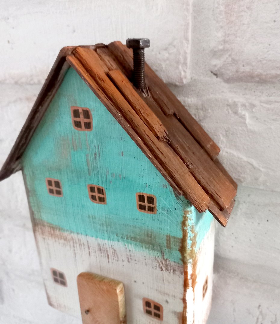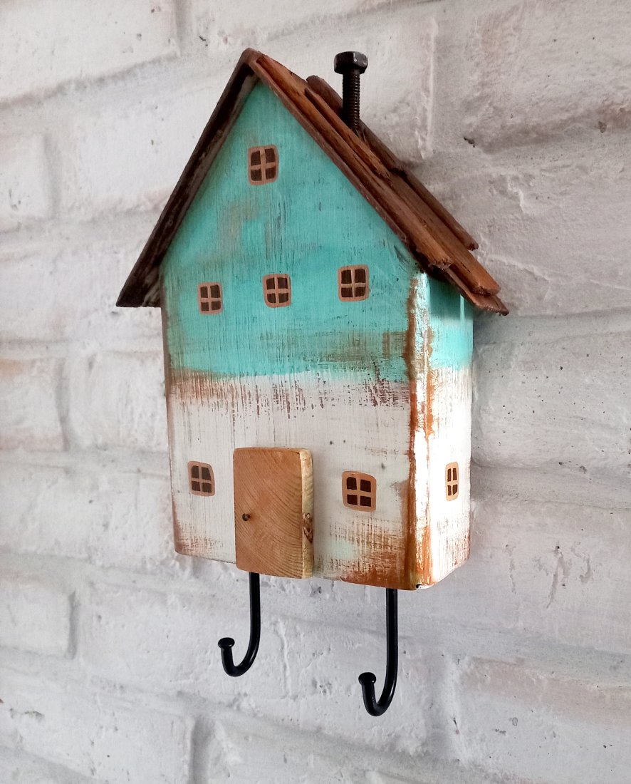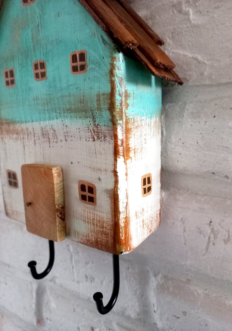 Unikatowy, ręcznie wykonany wieszak ścienny w kształcie uroczego domku. To nie tylko praktyczny element wyposażenia, ale też dekoracja, która nada wnętrzu przytulnego, sielskiego charakteru.