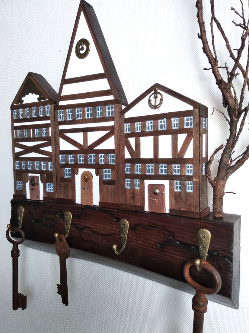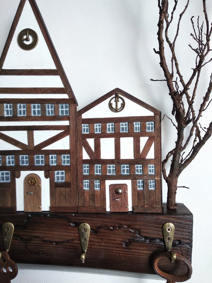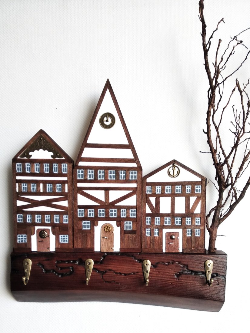 Klasyka, solidność i charakter – ten ręcznie wykonany wieszak to połączenie rzemieślniczej precyzji i ponadczasowego designu. Inspirowany architekturą szachulcową, przywodzi na myśl stare europejskie miasta, gdzie kunszt budowniczych i trwałość materiałów były kluczowe. Brązowe belkowania na jasnych fasadach tworzą surową, ale elegancką kompozycję, która idealnie pasuje do wnętrz z industrialnym, rustykalnym lub klasycznym akcentem.