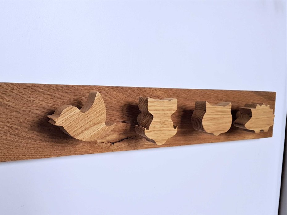 Oryginalny wieszak ścienny - na ubrania, torebki, czapki, wisiorki - cokolwiek, co przyjdzie Ci do głowy! W całości wykonany z litego drewna dębowego. Idealny do pokoju dziecka czy przedpokoju. Praktyczny i efektowny.