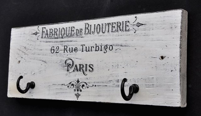 Drewniany wieszak malowany farbami akrylowymi, postarzony i pokryty lakierem bezbarwnym.