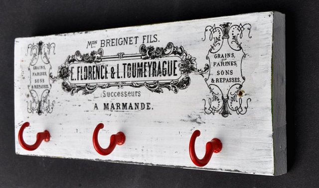 Drewniany wieszak malowany farbami akrylowymi, postarzony i pokryty lakierem bezbarwnym.