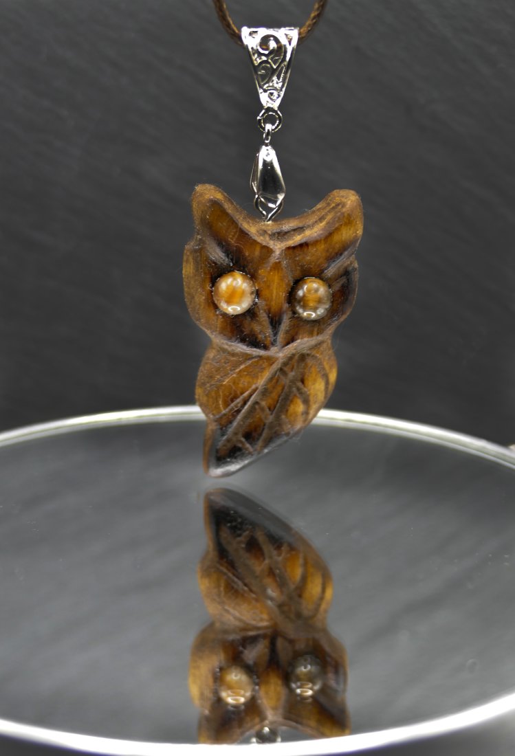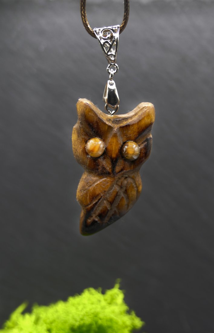 Artystyczny wisiorek w kształcie sowy, wykonany z brzozowego drewna. Ręcznie rzeźbiony, bejcowany na kolor orzecha z przecierkami i delikatnie opalany ogniem. Woskowana politura nadaje mu subtelny połysk. Wzrok przyciągają dwa naturalne kamienie – tygrysie oko – pełniące funkcję oczu.