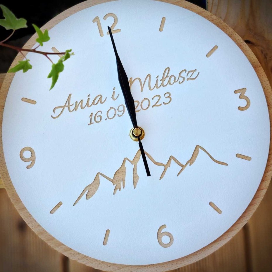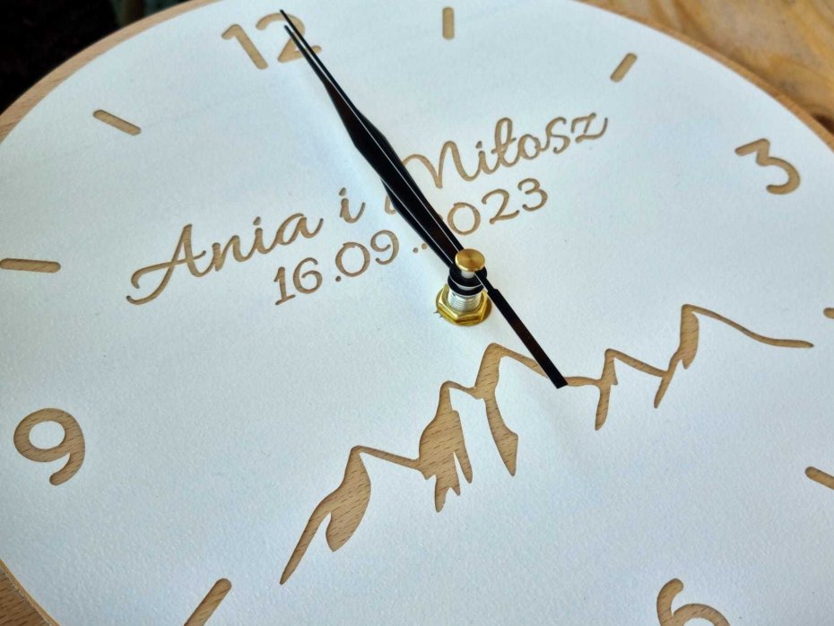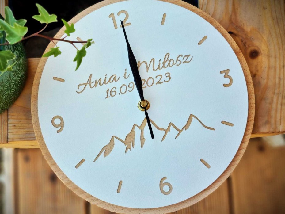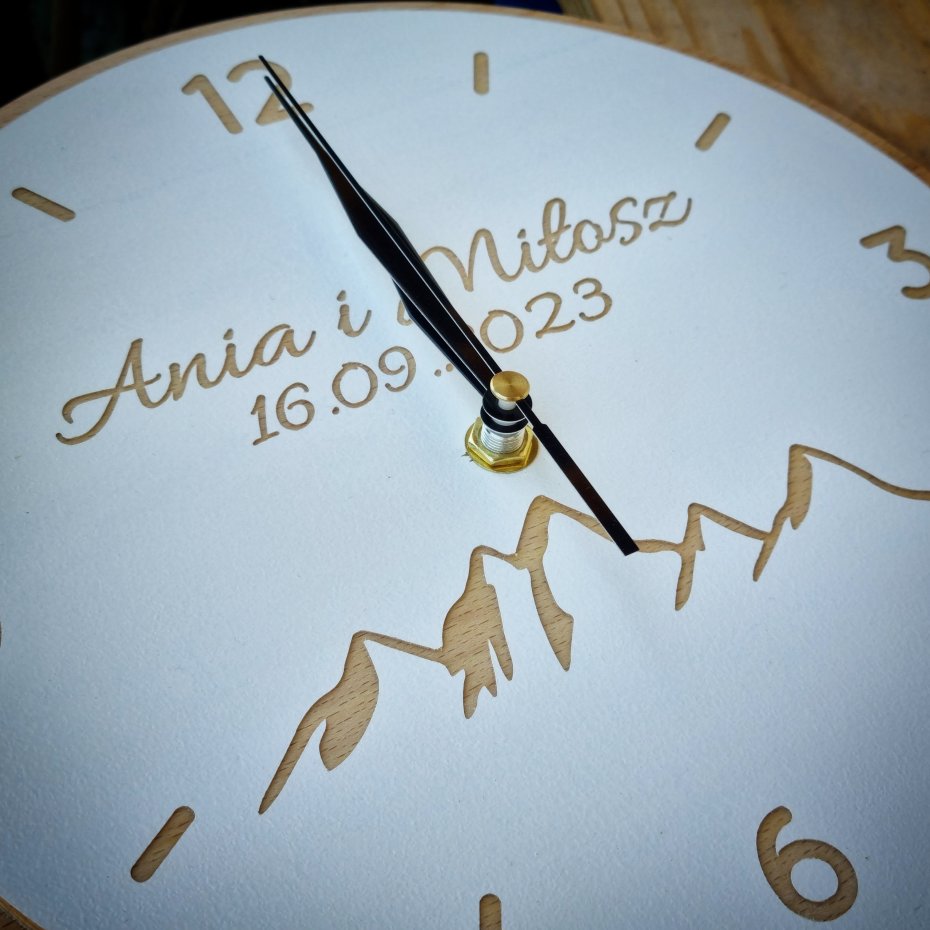 Nasz zegar "GÓRY" wykonany został w całości z litego drewna. Dajemy Wam możliwość indywidualnej personalizacji - dzięki czemu może stać się on przepięknym prezentem z okazji ślubu, rocznicy czy zaręczyn.