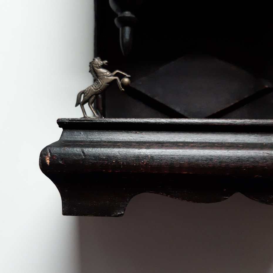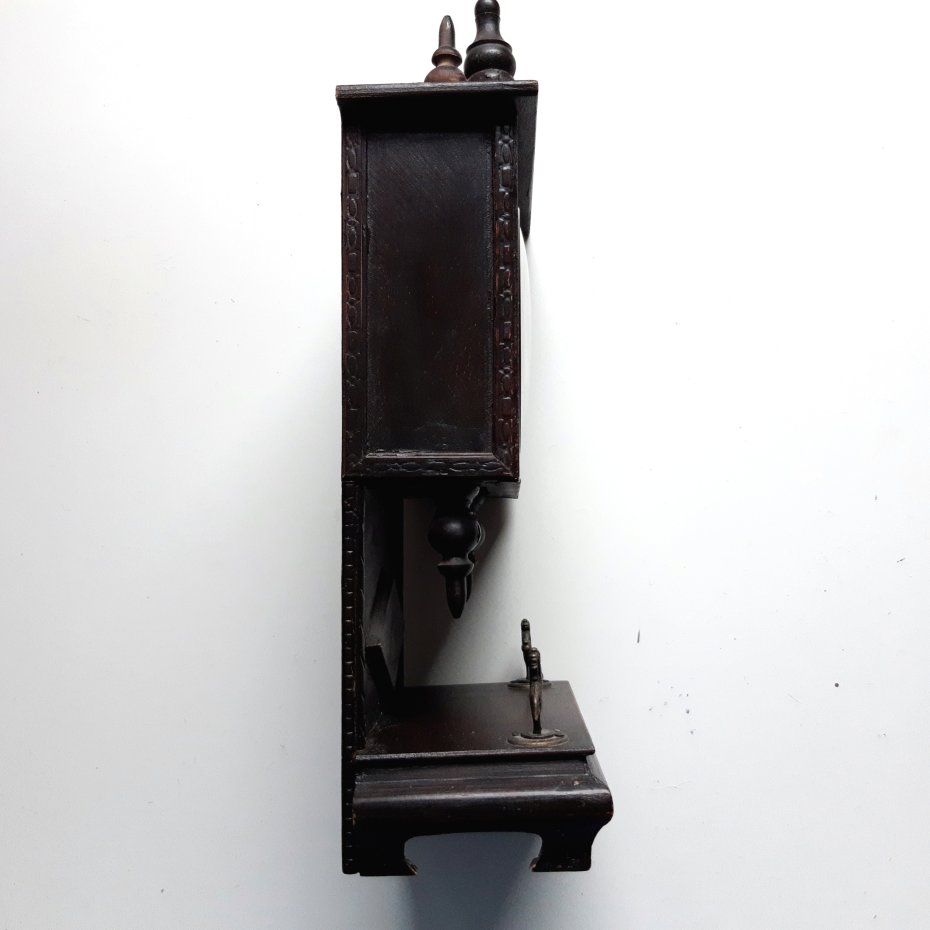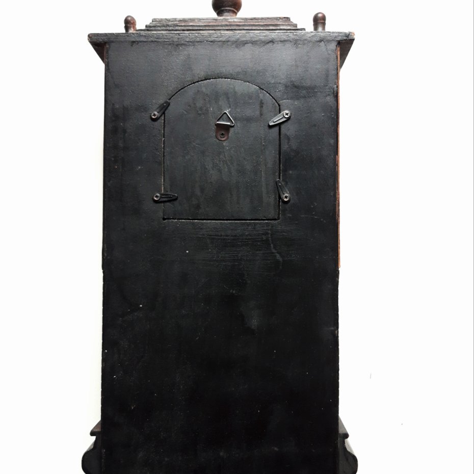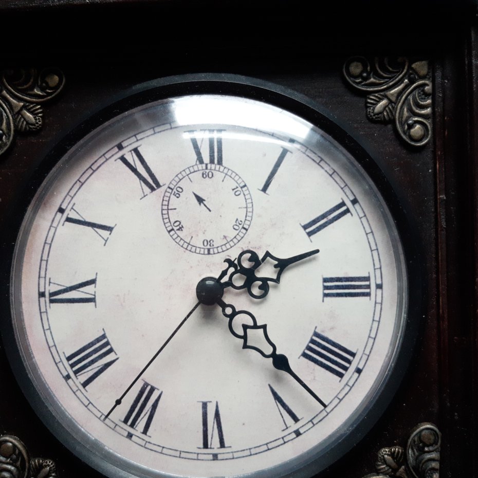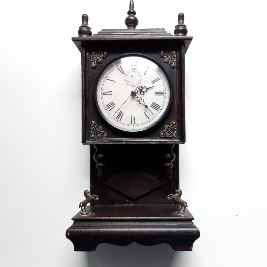 Zegar średnich rozmiarów w stylu Vintage w drewnianej obudowie z metalowymi ozdobnikami. Ciemno brązowy kolor. Malowany.