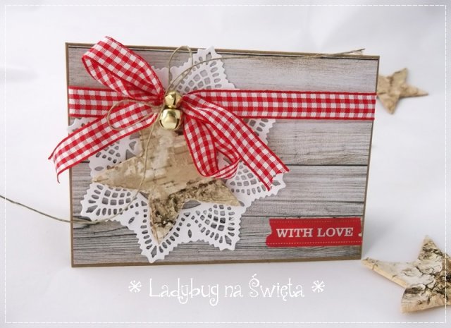 Wyjątkowa kartka świąteczna, prosta w formie i oszczędna w stylu, jednakowoż niebanalna i pełna ciepła. Na drewnianym tle, czerwona wstążka z dźwiecznymi dzwoneczkami i gwiazdką wyciętą z kory brzozy.