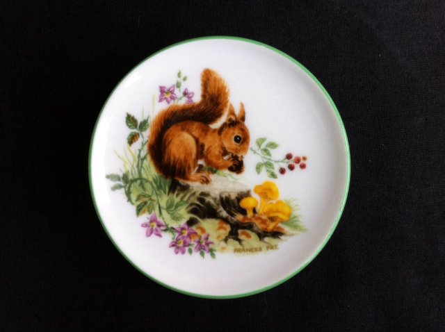 Mały talerzyk-spodeczek do powieszenia, sygnowany Crown Staffs, angielski. Barwny urok wiewiórkowej obecności :) 8 x 1 cm. Stan zachowania bardzo dobry.