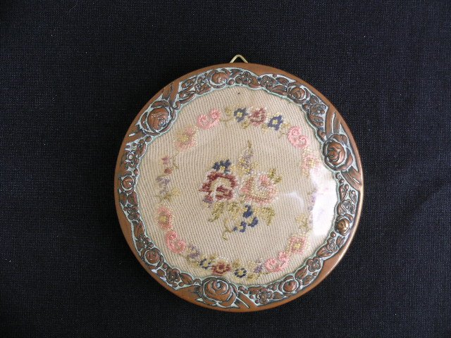 Dawniej przykrywka od kosmetycznego pojemnika szklanego, który nie dotrwał do naszych czasów w całości. Stary angielski wyrób - w metalowej stylizowanej obejmie ręczny haft kwiatowy pod przezroczystą osłonką. Teraz szykownym medalionem do powieszenia być może :) 9 x 2 cm. Stan zachowania jak na starą rzecz - dobry plus.