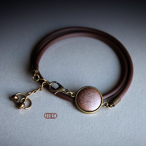 Efektowna bransoletka wykonana z linki kauczukowej w kolorze brązowym, elementów w kolorze starego złota i ręcznie wykonanej ceramicznej zawieszki, szkliwionej mieszanką brązowych szkliw z efektem połyskujących drobinek, Obwód regulowany. Polecam