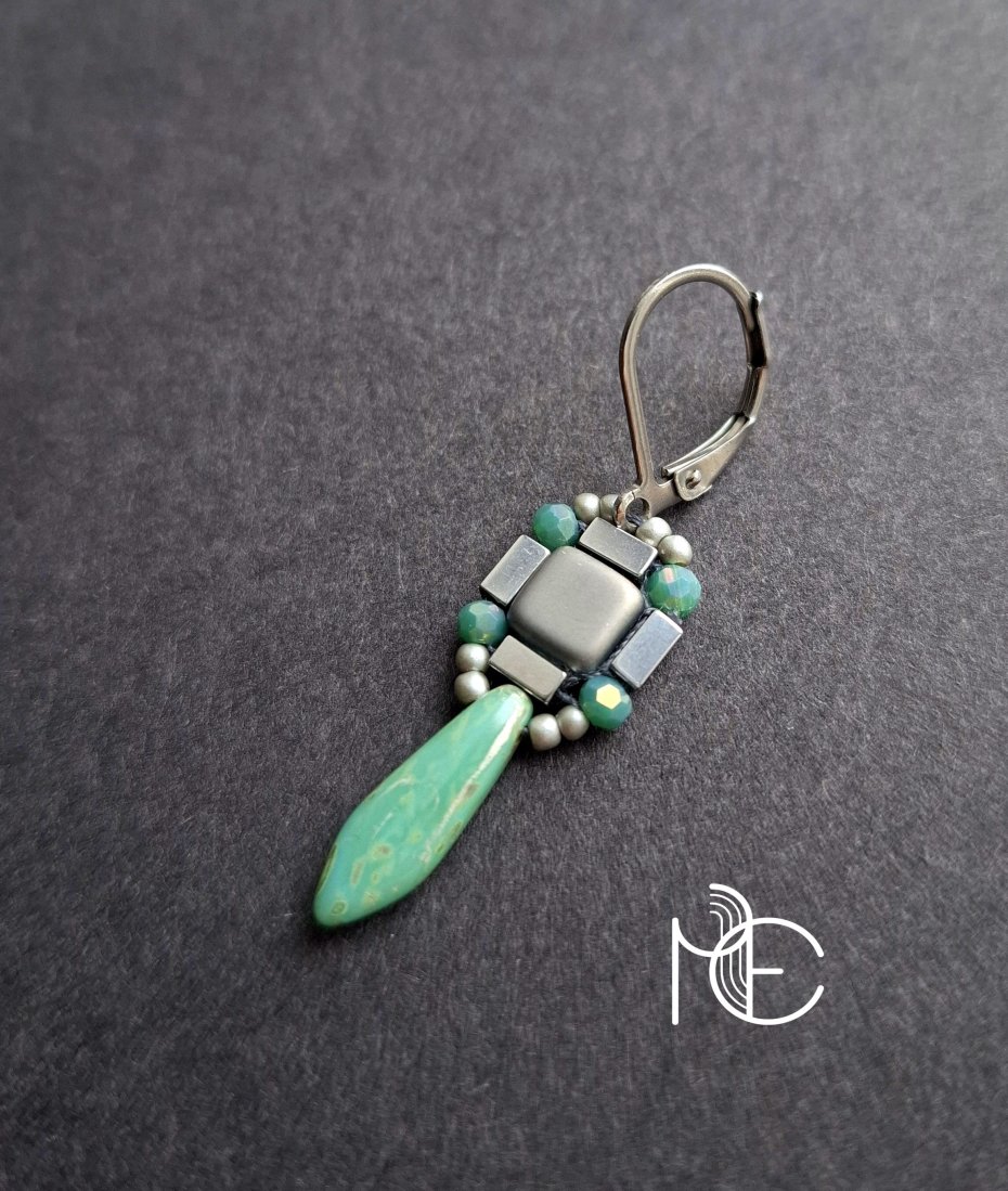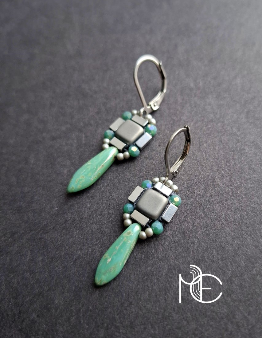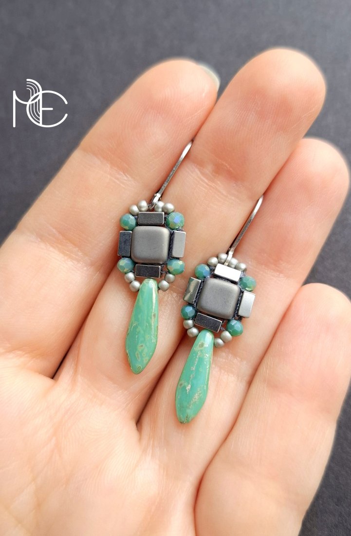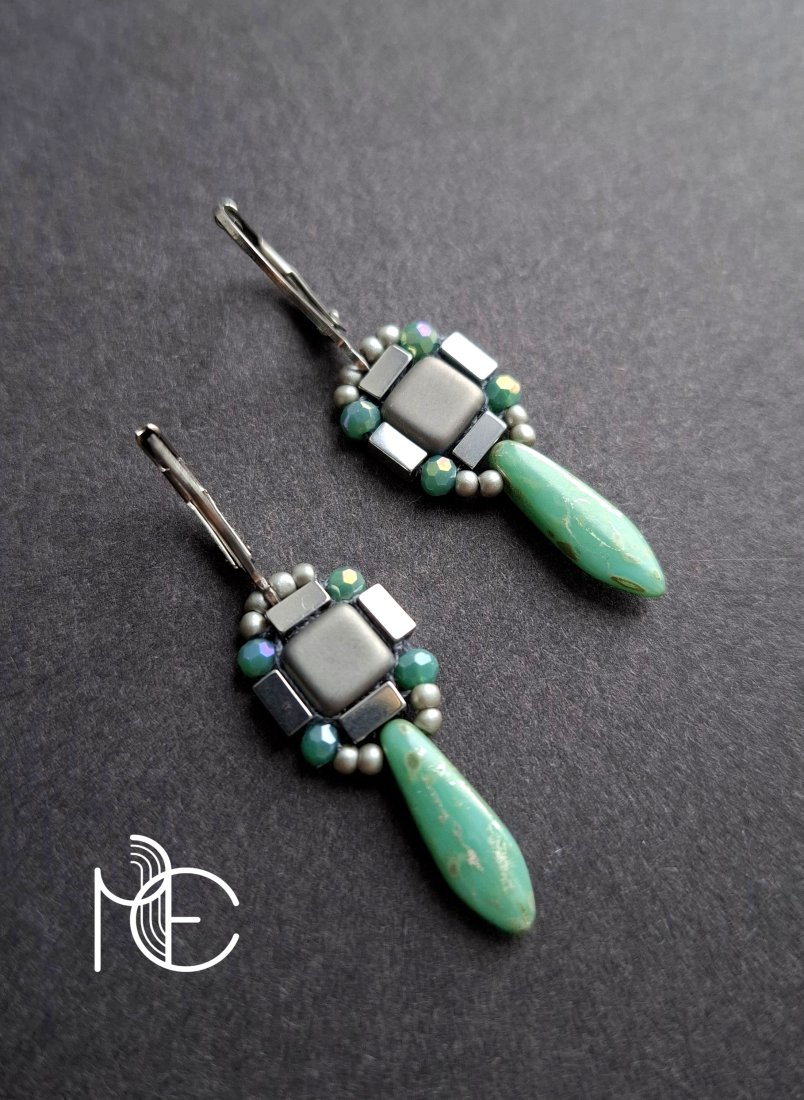 Kolczyki wiszące wykonane techniką swoistego haftu drobnymi, szklanymi koralikami w połączeniu z hematytami platerowanymi. Dwustronne, podwieszone na posrebrzanych, nieuczulających biglach typu angielskiego. Wymiary: długość wraz z zapięciem - 4,1 cm, szerokość max. 1,2 cm.
