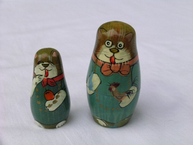 Drewniana matrioszka w wersji kociej :) Ręcznie malowana, naiwnie urocza. Wysokości 6 i 4,5 cm. Na większym kocie ubytek malatury. Stan zachowania dobry i dobry minus.