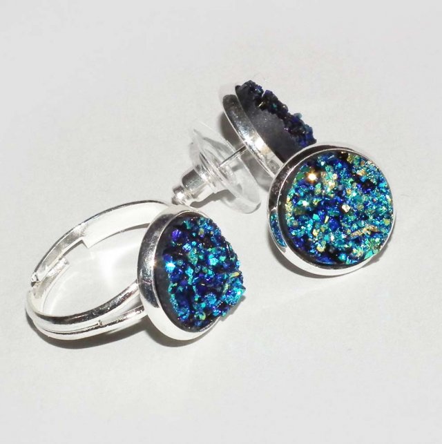 Efektowny, ręcznie robiony komplet biżuterii: pierścionek i kolczyki wkrętki z oczkami z żywicy akrylowej druzy, która piękne błyszczy barwami od głębokiego błękitu po zieleń o odcieniach morskiej toni. W feerię barw wkrada się także intrygujące indygo i iskrzący fiolet. Biżuteria hipoalergiczna, nie zawiera niklu i ołowiu.