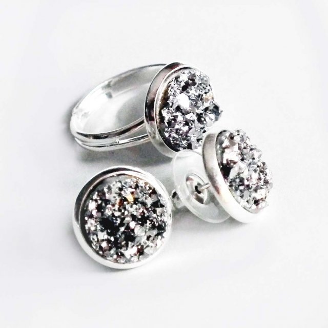 Efektowny, ręcznie robiony komplet biżuterii: pierścionek i kolczyki wkrętki z żywicą druzy w kolorze ciemnym srebrnym, oprawioną w hipoalergiczną bazę w kolorze srebra. Żywica jest bardzo urokliwa, pięknie mieni się i skrzy odcieniami srebra od jasnego do ciemnego, w zależności od kąta patrzenia. Biżuteria hipoalergiczna, nie zawiera niklu i ołowiu.