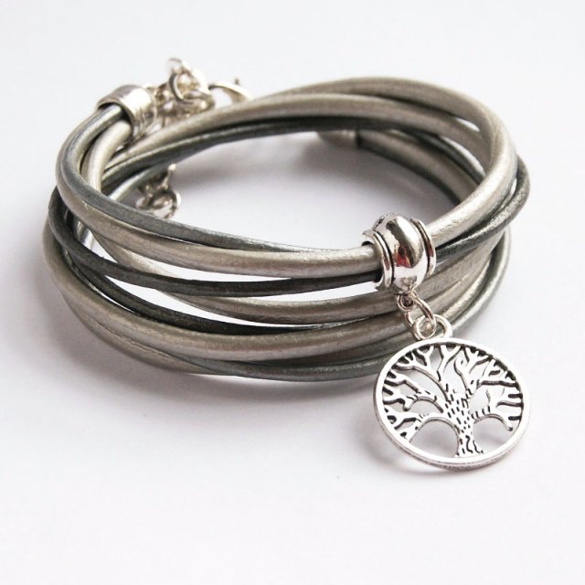 POMYSŁ NA PREZENT ;-) delikatna bransoletka wykonana z 4 rzemieni ze 100% skórki naturalnej w odcieniach metalicznych/perłowych (po 2 rzemienie 3mm i 2mm); duża zawieszka (DRZEWKO SZCZĘŚCIA) i wykończenie w kolorze srebra. długość regulowana za pomocą łańcuszka. BRANSOLETKA PASUJE NA NADGARSTEK OD 14,5CM. możesz ją nosić samodzielnie lub dowolnie łączyć z innymi bransoletkami z tej serii. świetnie prezentuje się też w zestawieniu z bransoletkami z kamieni naturalnych. UWAGA! CENA DOTYCZY 1 BRANSOLETKI (1 DRZEWKO SZCZĘŚCIA) w kolorystyce ze zdjęcia 1. ... spójrz jak podobna bransoletka prezentuje się na nadgarstku ... ZOBACZ CAŁĄ KOLEKCJĘ!!! ... MOJA BIŻU ZAWSZE PODRÓŻUJE OZDOBNIE ZAPAKOWANA - opakowanie hand made ;-)