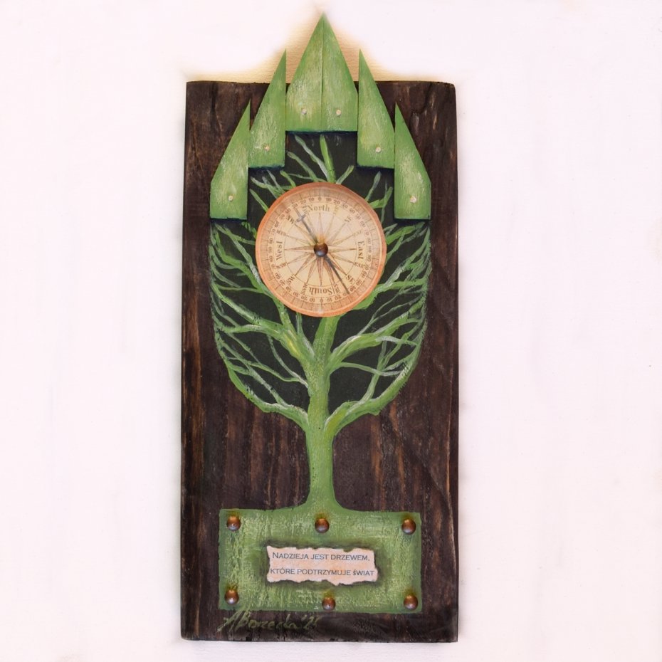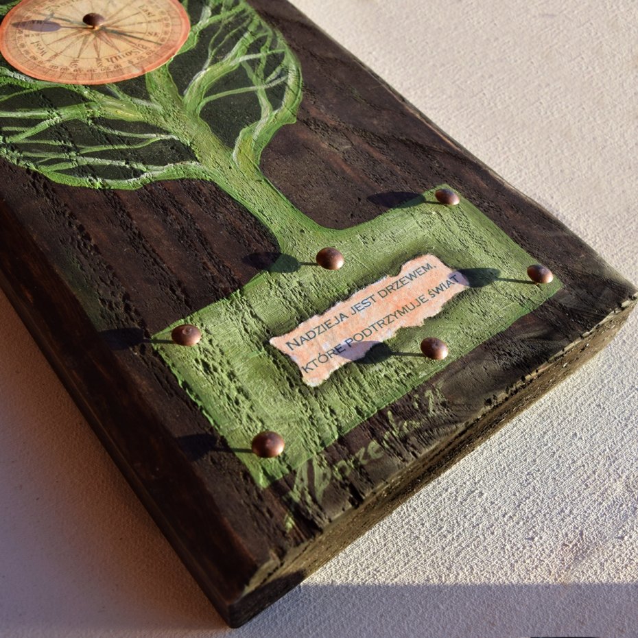 Obraz - abstrakcyjne drzewo - wykonany w technice mieszanej na kawałku deski sosnowej (tło jest bejcowane, drzewo malowane farbami akrylowymi). W projekcie wykorzystane są również sosnowe listewki, pinezki oraz elementy collage. Słowa cytatu przypisywane są Pliniuszowi Starszemu.