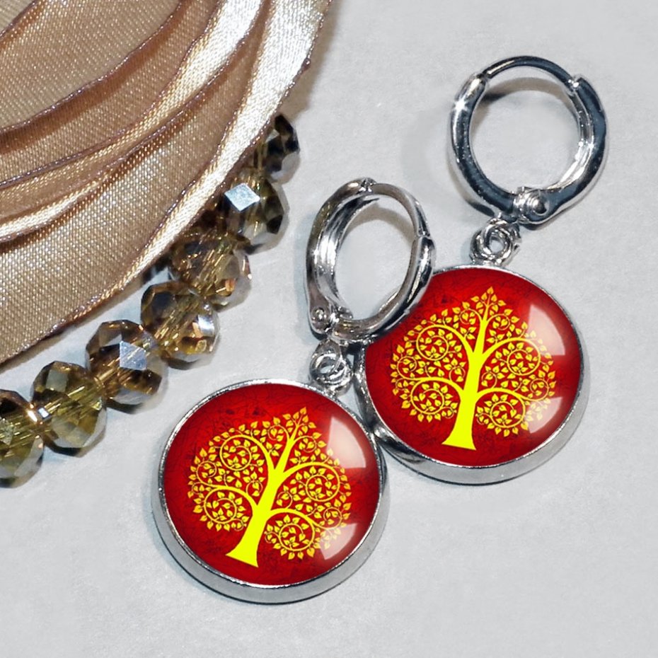 Delikatne kolczyki wiszące z artystyczną grafiką, zatopioną pod wypukłym szkiełkiem, w oprawie i w kolorze srebrnym.