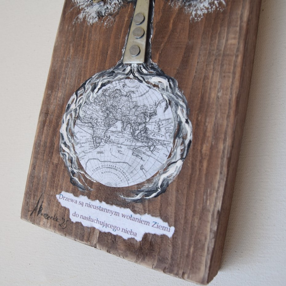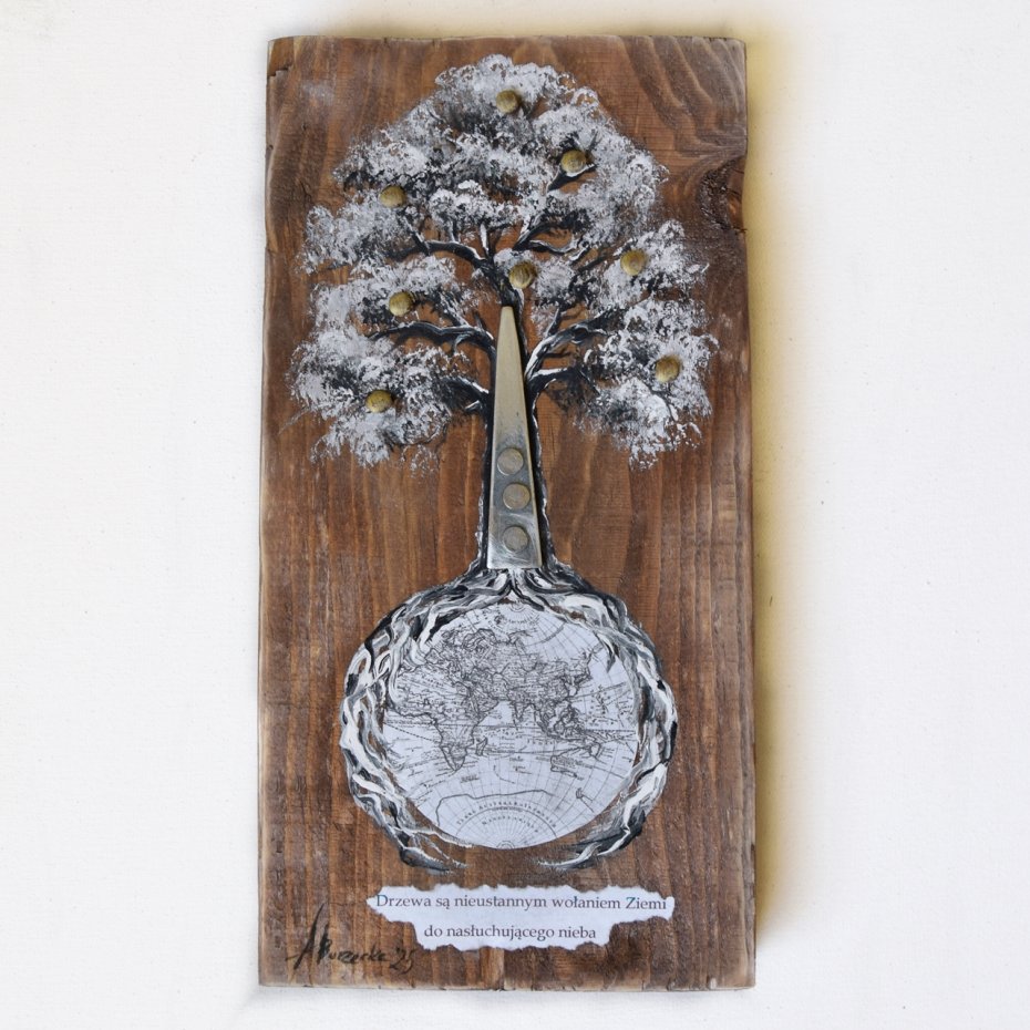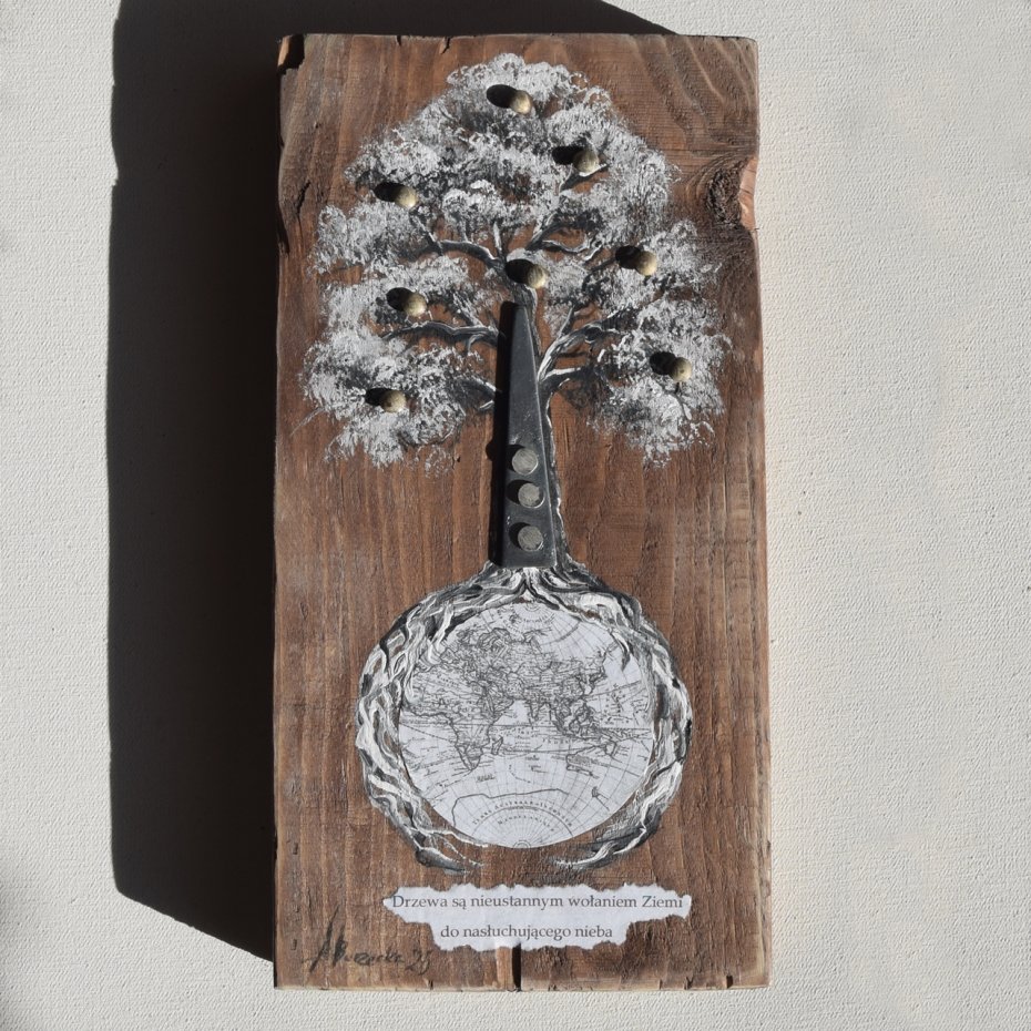 Obraz - abstrakcyjne drzewo - wykonany w technice mieszanej na kawałku deski sosnowej (tło jest bejcowane, drzewo malowane farbami akrylowymi). W projekcie wykorzystany jest również metalowy łącznik, pinezki i gwoździe, oraz element collage. Autorem cytatu jest Rabindranath Tagore.