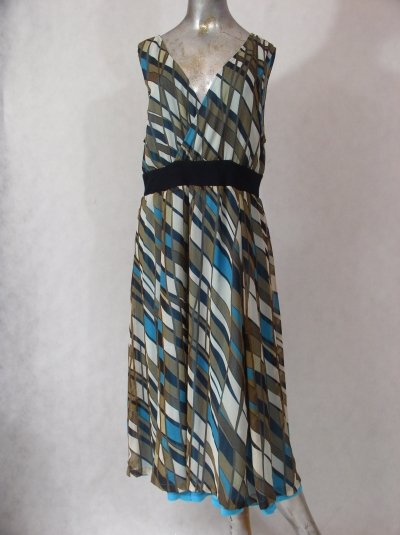 Sukienka duńska www.nillephilbert.com Rozmiar 44.Materiał-spód z niebieskiej,miękkiej bawełny,wierzch syntetyk.Odcięta w pasie z wstawionym czarnym pasem.Góra mocno wycieta z tyłu i z przodu skrzyżowana.Stan bardzo dobry.Długość 119 cm.pod pachami 100 cm.mierzone na płasko.pas 88 cm.