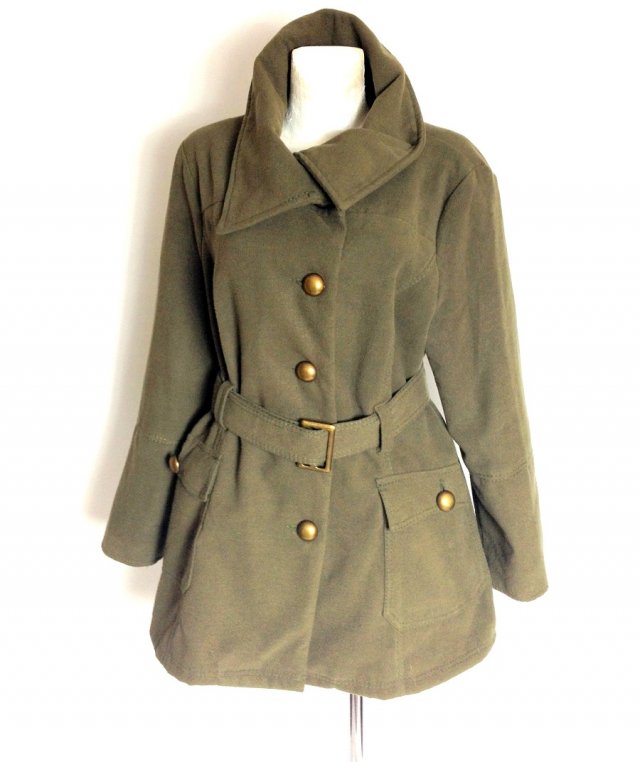 Oryginalny jesienny płaszcz marki Dunnes w kolorze khaki o fasonie rozkloszowanym z paskiem , zapinany na duże guziki, po bokach sporej wielkości kieszenie, wysoki kołnierz który bez problemu możemy nosić jako postawiony, z tyłu płaszcza rozcięcie. Posiada podszewkę.