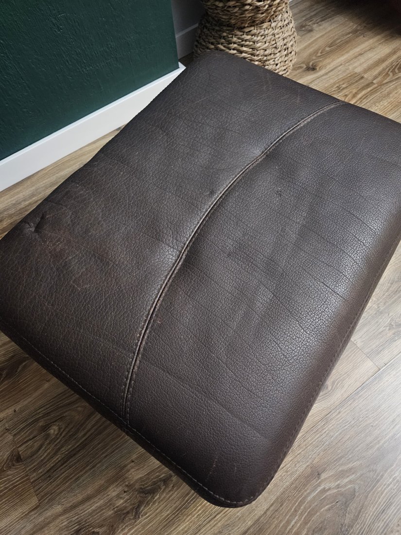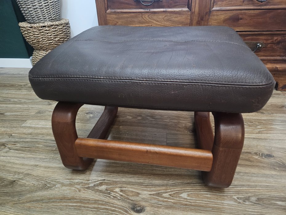 Solidny a zarazem stylowy podnóżek wykonany z drewna tekowego, pufa pokryta skórą naturalną