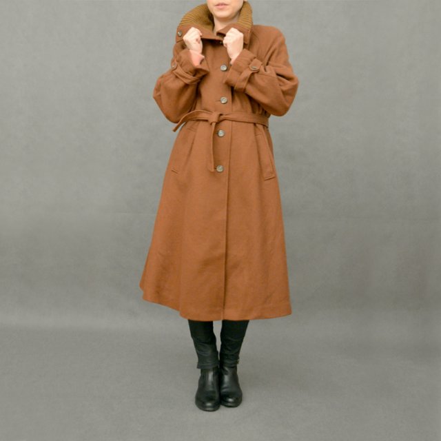 Piękny, wełniany, duński płaszcz w rudobrązowym kolorze. Kołnierz od spodu ala swetrowy. W talii wiązany. Na podszewce.