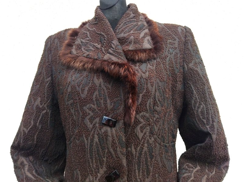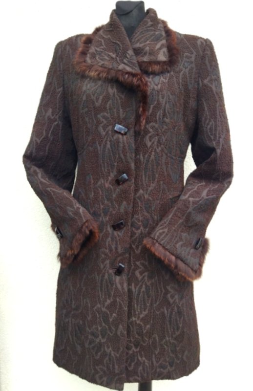 Wspaniały ocieplany płaszcz o ponadczasowym kroju z wełnianej tkaniny z ciekawą faktura w kolorze gorzkiej czekolady z wykończeniem z króliczego futerka w tym samym kolorze. Starannie uszyty i wykończony. Taliowany , z wykładanym kołnierzem, z dwiema wpuszczanymi kieszeniami, z krytym rozcięciem z tyłu, mankiety rękawów z rozcięciem złączonym guzikiem . Zapinany na ozdobne podłużne guziki a' la spinki. Całośc na pikowanej ocieplanej podszewce. Ładniejszy w realu