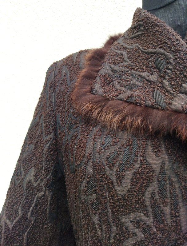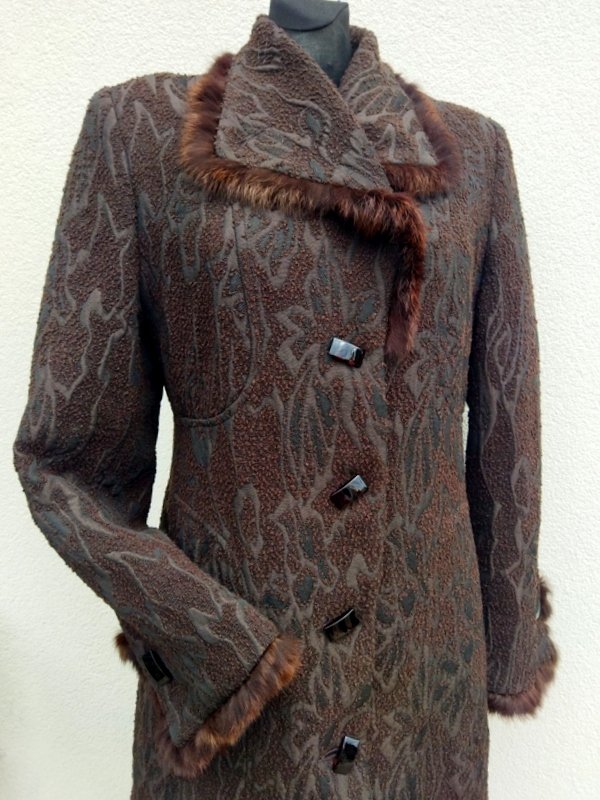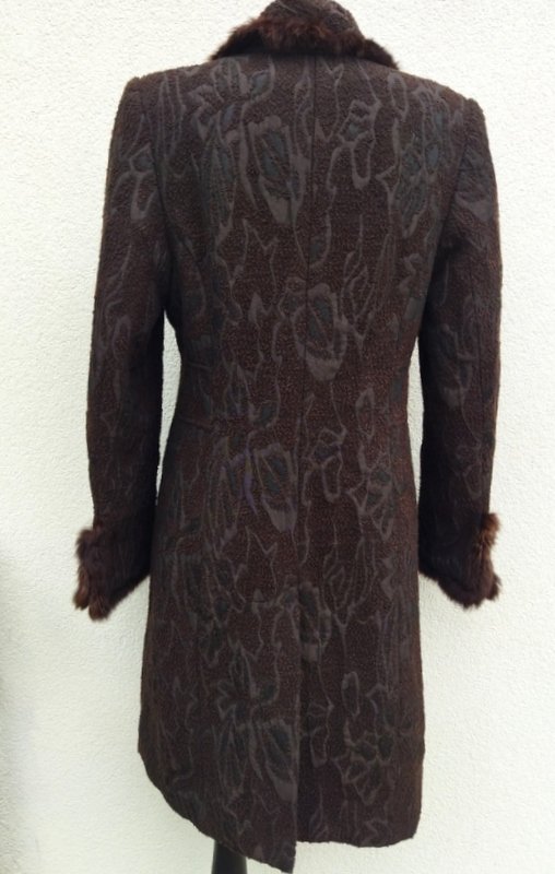 Wspaniały ocieplany płaszcz o ponadczasowym kroju z wełnianej tkaniny z ciekawą faktura w kolorze gorzkiej czekolady z wykończeniem z króliczego futerka w tym samym kolorze. Starannie uszyty i wykończony. Taliowany , z wykładanym kołnierzem, z dwiema wpuszczanymi kieszeniami, z krytym rozcięciem z tyłu, mankiety rękawów z rozcięciem złączonym guzikiem . Zapinany na ozdobne podłużne guziki a' la spinki. Całośc na pikowanej ocieplanej podszewce. Ładniejszy w realu