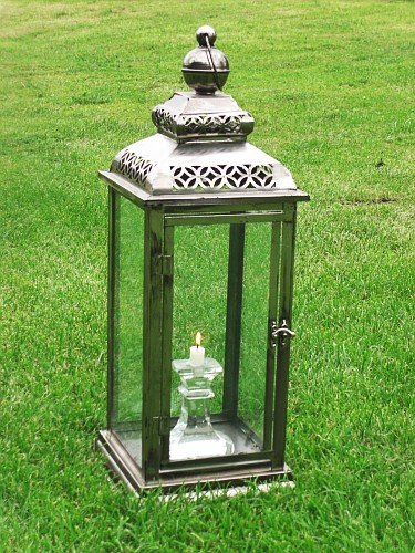 Bardzo duża praktyczna Latarnia Lampion. Metalowa niklowana. Do wnętrza, ogrodu, na taras... Surowa podstawa na bazie kwadratu zwieńczona orientalizującą, jakby minaretową ażurowością dachu. Do powieszenia. Z praktycznym dużym okrągłym uchwytem, więc i do przenoszenia wygodna :) Z każdej strony przeszklona. Solidna, wygodna, efektowna. Podstawa 25; wysokość z uchwytem 70; wnętrze za szybą 13 x 32 cm. Stan zachowania bardzo dobry.