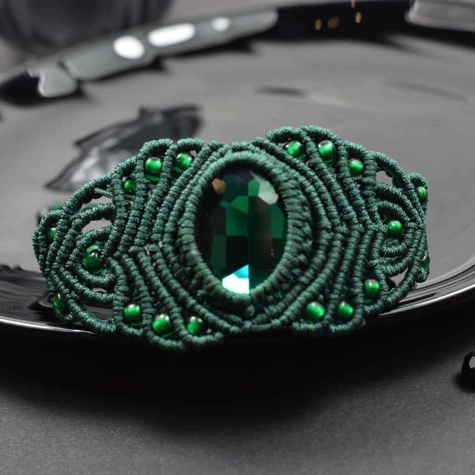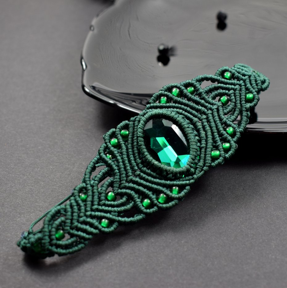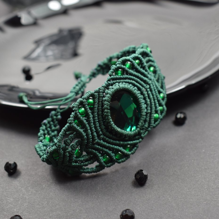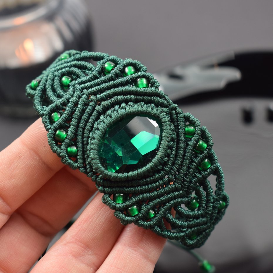 Ręcznie wykonana bransoletka stworzona techniką makramy z profesjonalnego, wytrzymałego sznurka w odcieniu głębokiej butelkowej zieleni. W centrum kompozycji znajduje się szmaragdowy kryształ, który pięknie mieni się w świetle, przyciągając uwagę subtelnym blaskiem i elegancją.