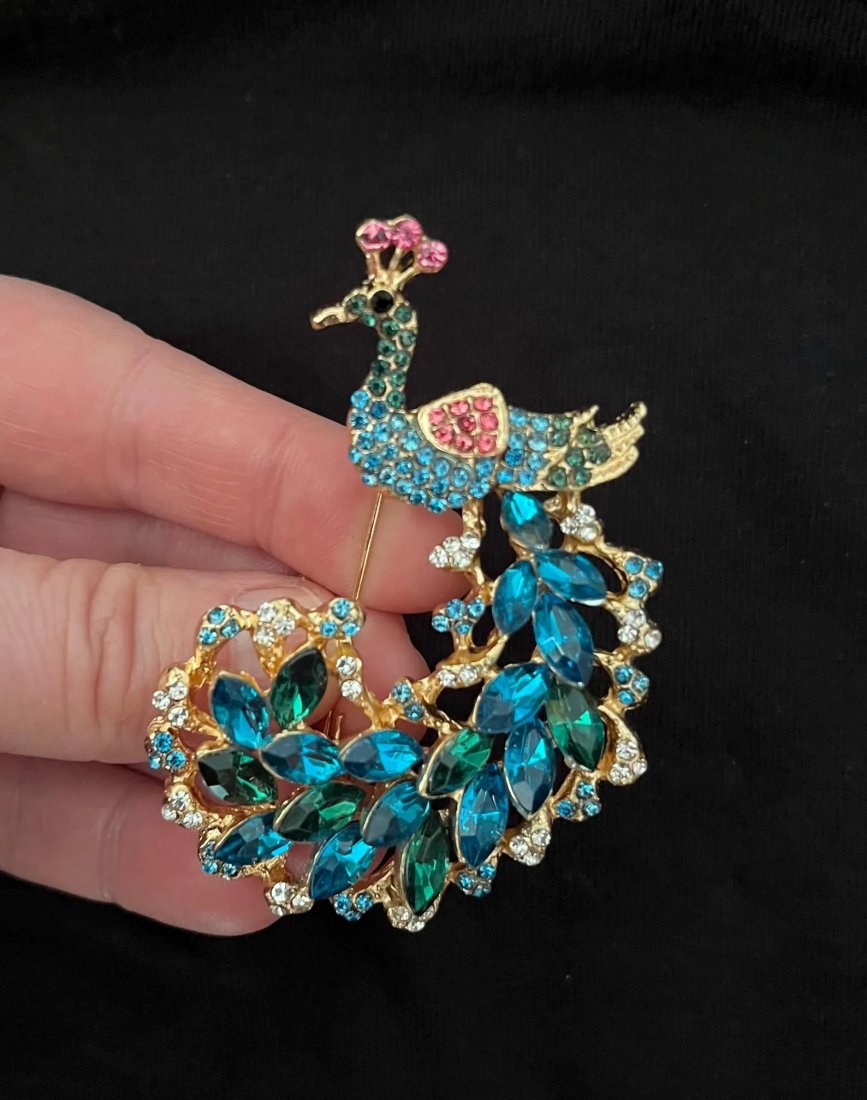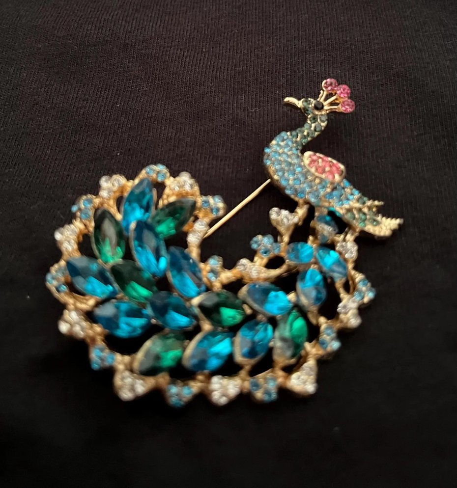 Ta bogato zdobiona broszka o wymiarach 6,5 x 5 cm składa się z warstw szmaragdowych i ciemnoniebieskich kryształków tworzących ogon pawia, podkreślonych przez przezroczyste kryształki oraz delikatnie zdobioną figurkę ptaka.