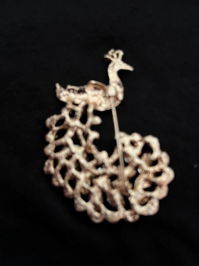 Efektowna broszka w stylu vintage przedstawiająca pawia, charakteryzująca się imponującym wyglądem