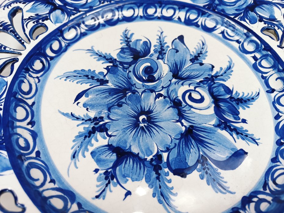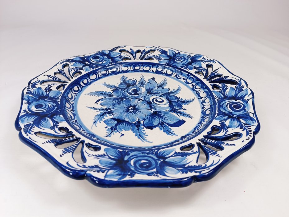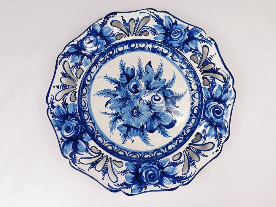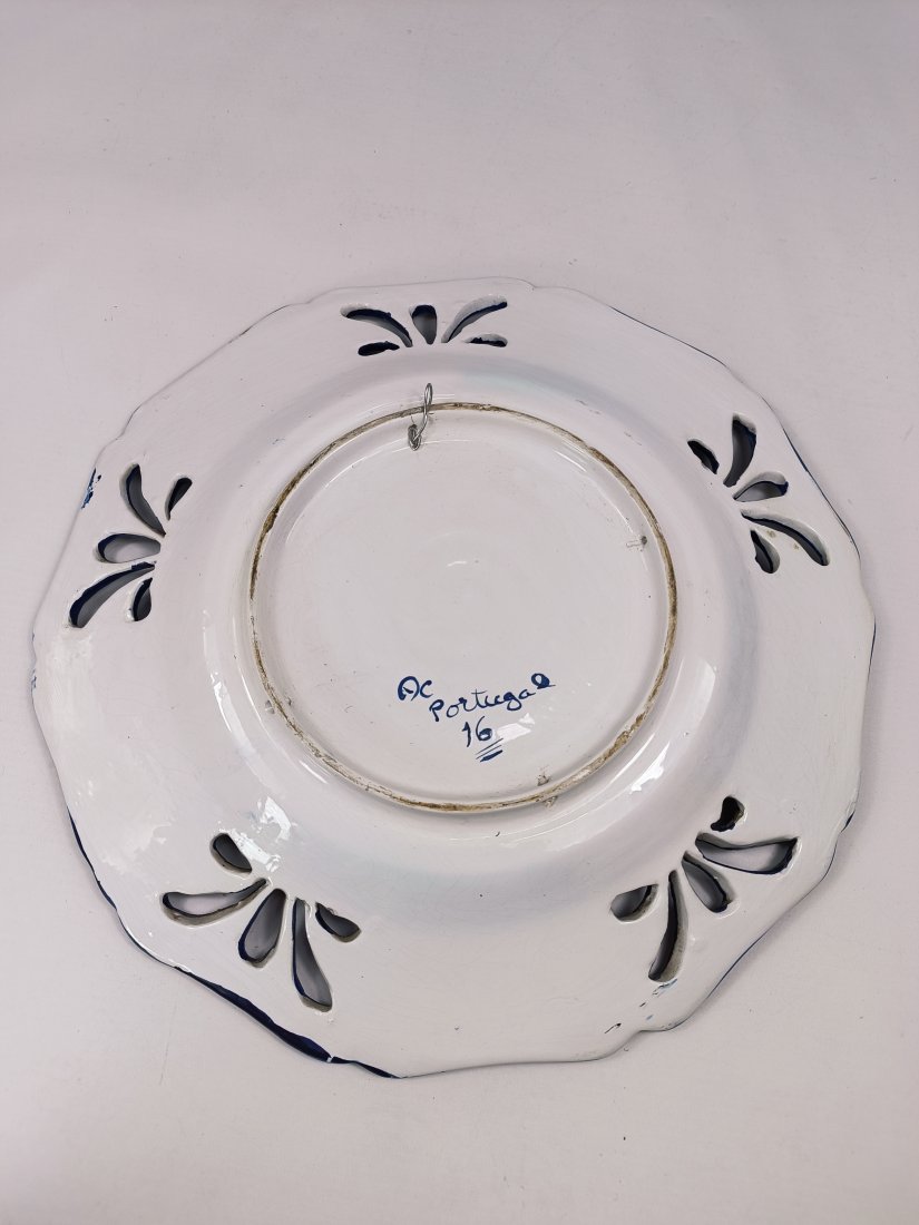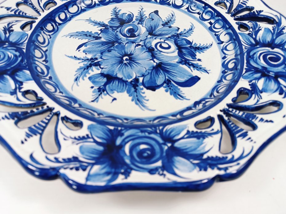 Duża ceramiczna, portugalska patera. Ceramika ażurowa z ręcznie malowanymi niebieskimi kwiatami. Na spodzie sygnatura oraz zawieszka na ścianę. Stan zachowania bardzo dobry, bez uszkodzeń. Średnica 34 cm.