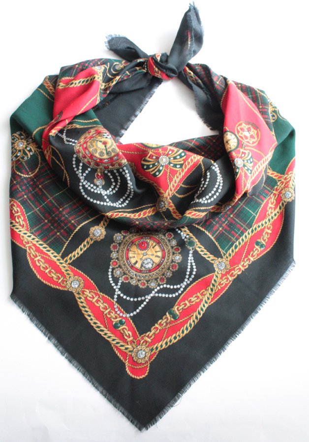 Duża chusta w królewskie wzory w stylu domu mody Hermes. Materiał to prawdopodobnie wiskoza.
