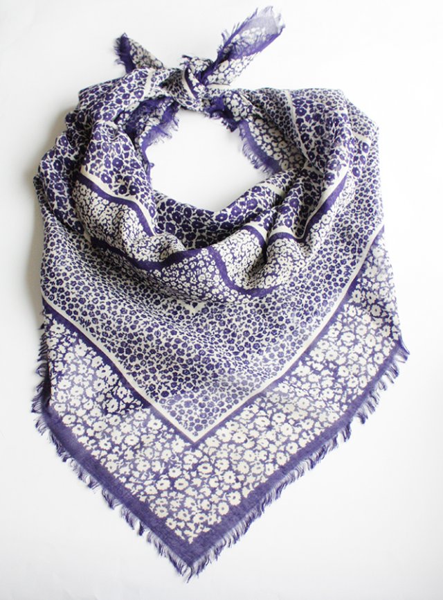 Duża chusta w kwiatowe motywy. Odcień to fiolet przechodzący w chaber. Materiał to prawdopodobnie wiskoza.