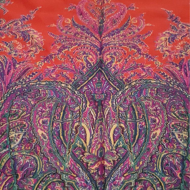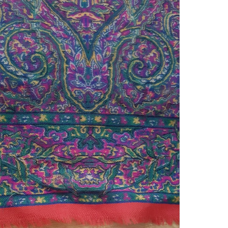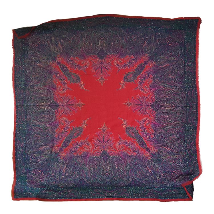 Piękna, wełniana chusta z motywami roślinnymi. Przeważające kolory: czerwień, fiolet, niebieski, szmaragdowy, beżowy. Przez wzgląd na kształt i rozmiar może również posłużyć jako obrus.