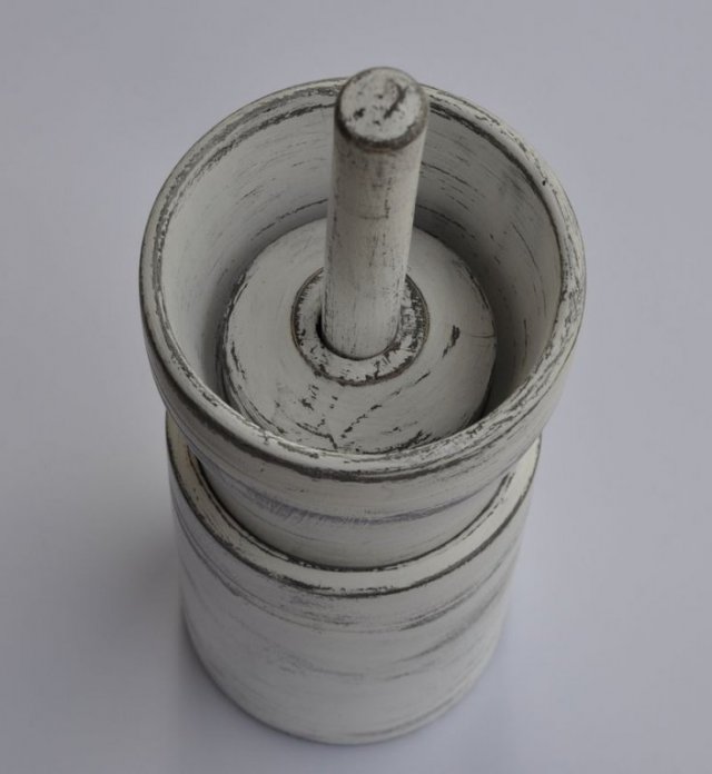 Duża drewniana maselnica malowana farbami akrylowymi, postarzana specjalną techniką. Pomalowana lakierem bezbarwnym.
