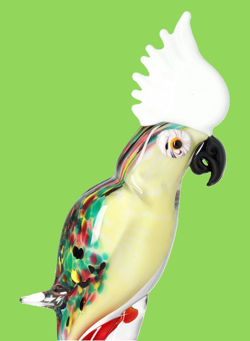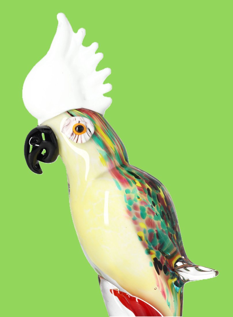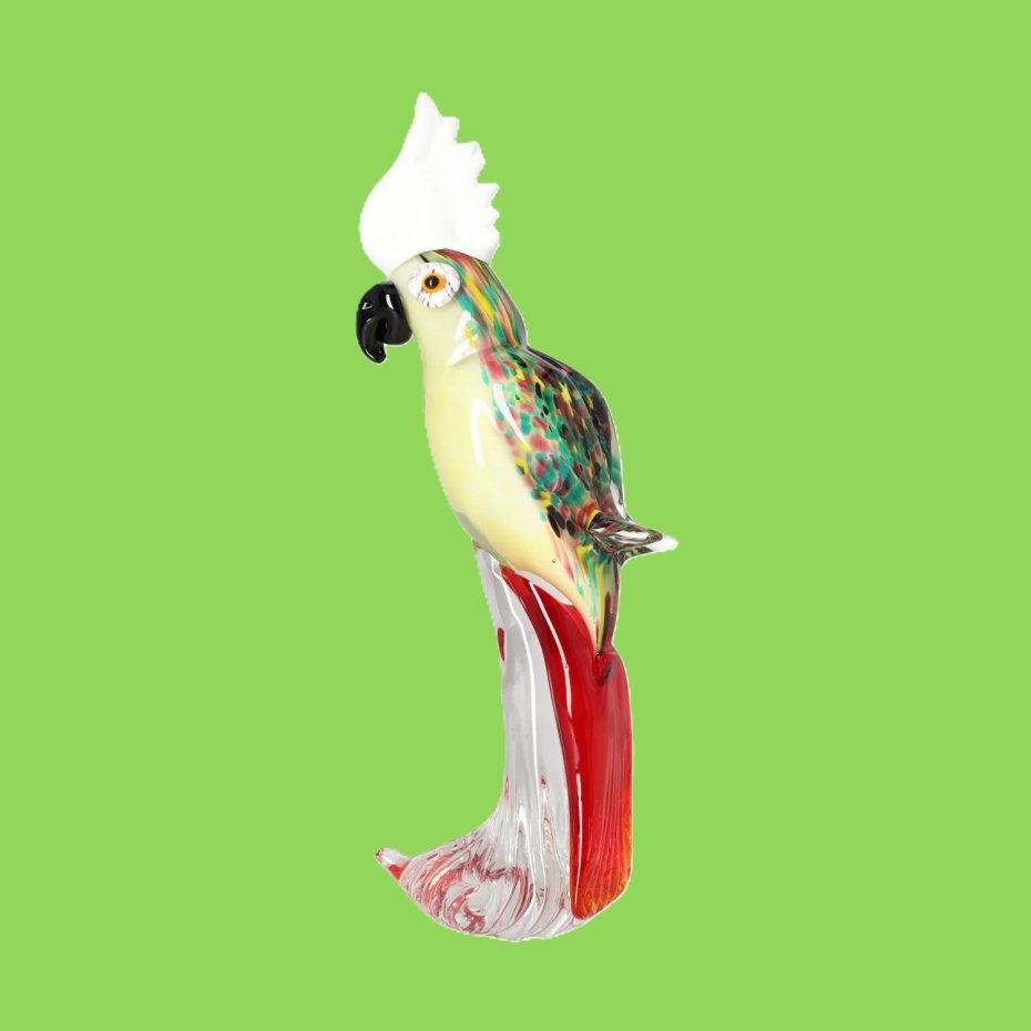 Przedmiotem aukcji jest wyjątkowa, żywa rzeźba papugi wykonana w stylu weneckiego szkła Murano. Ta imponująca figura o wysokości 35 cm wnosi do wnętrza tropikalną radość, energię i luksusowy charakter. Dzięki eleganckiej sylwetce oraz błyszczącemu wykończeniu, rzeźba wspaniale operuje światłem, stając się centralnym punktem każdej kolekcji, kredensu czy stylowego biura.