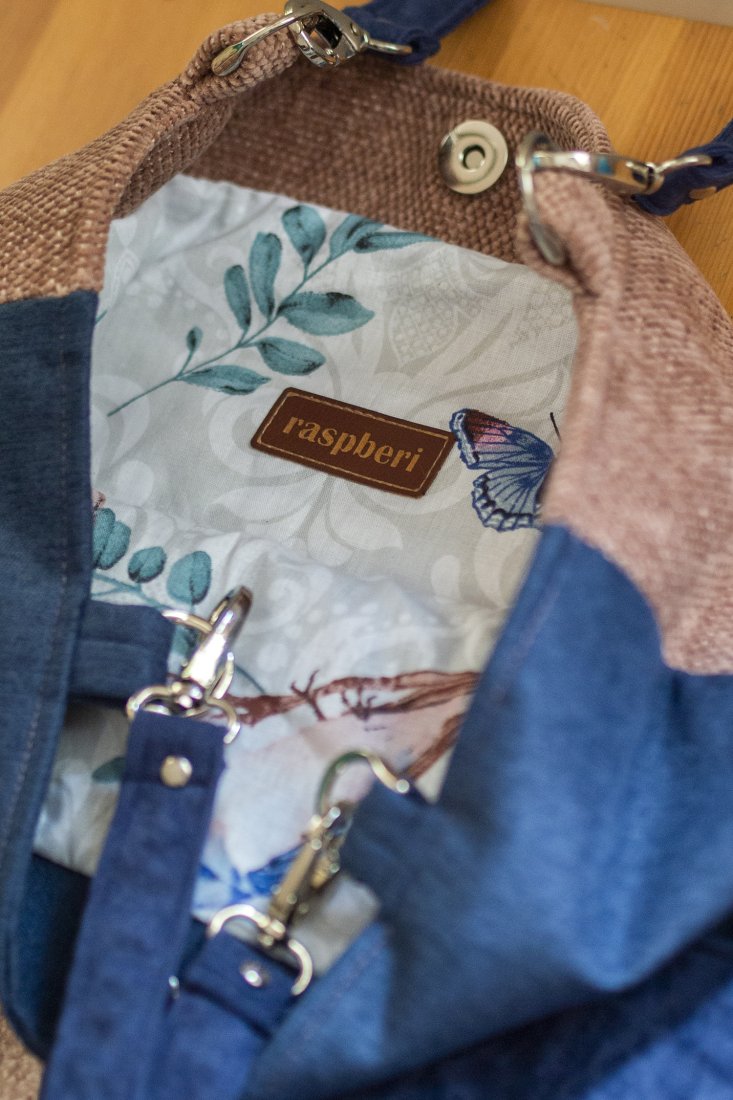 Bawełniana, biała podszewka we wzory, w środku i z tyłu torby kieszonki zapinane na suwak.