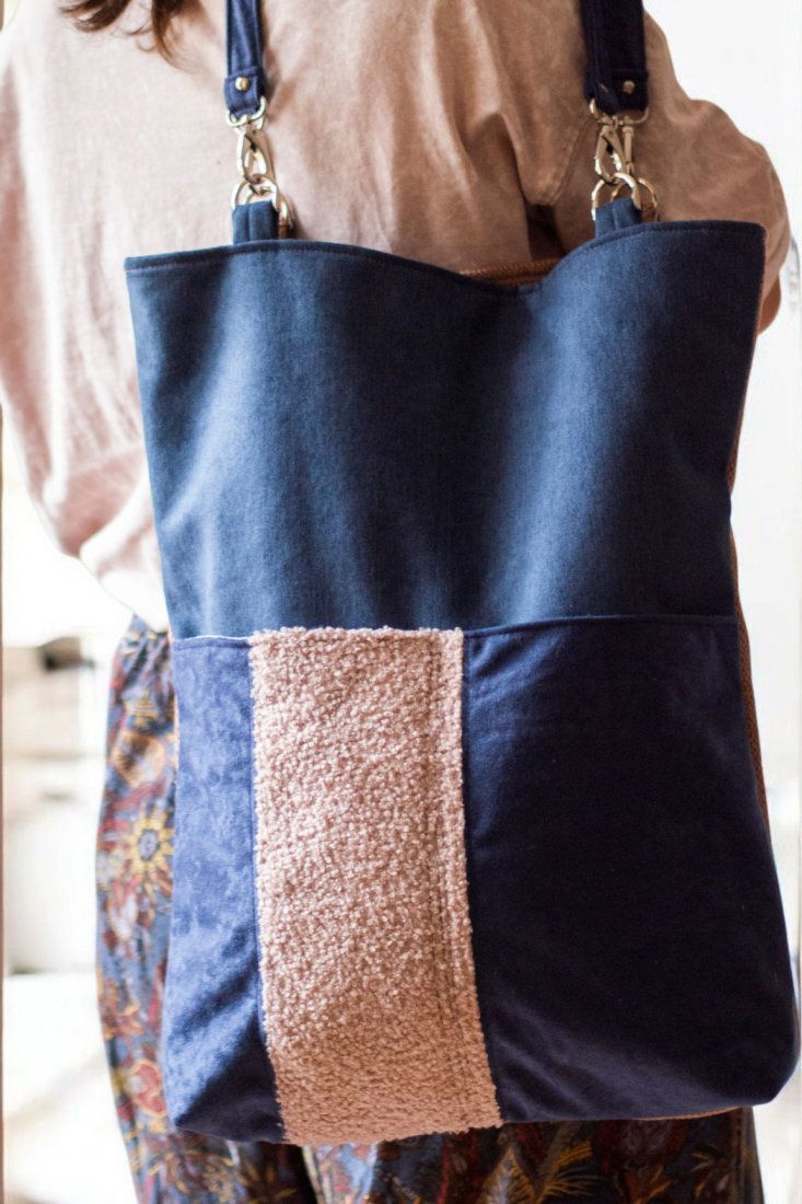 Duża torba na ramię wykonana z niebieskiej tkaniny.