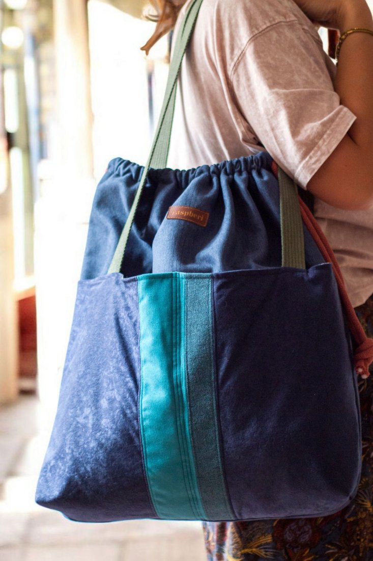 Wykonana z tkaniny w kolorze granatowym, z przodu dwie kieszenie z kilku rodzajów kolorowych tkanin. Bawełniane, oliwkowe pasy i jasna, bawełniana podszewka w kwiaty.