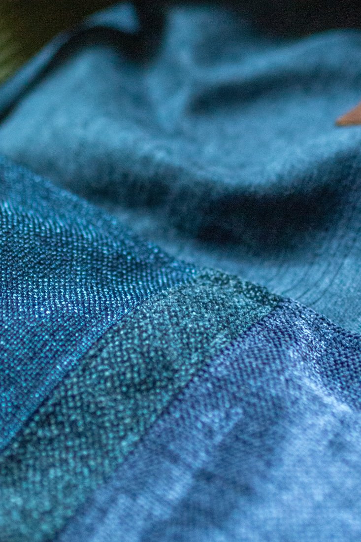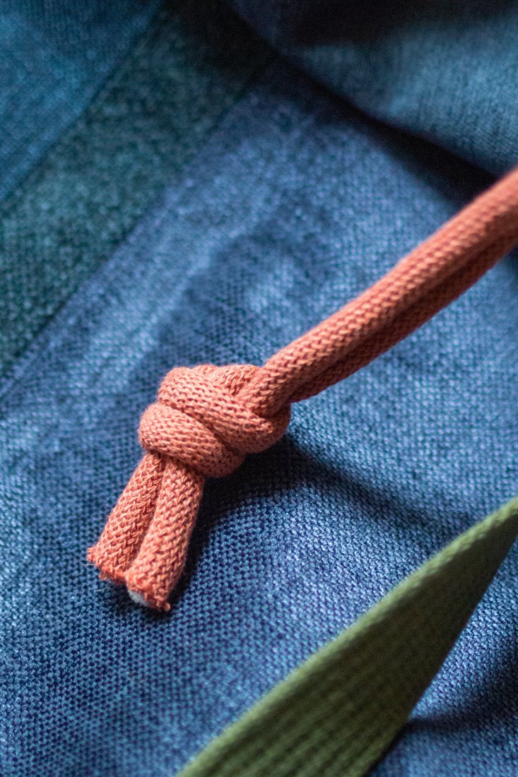 Wykonana z tkaniny w kolorze granatowym, z przodu dwie kieszenie z kilku rodzajów granatowych tkanin. Bawełniane, oliwkowe pasy i jasna, bawełniana podszewka w kwiaty.