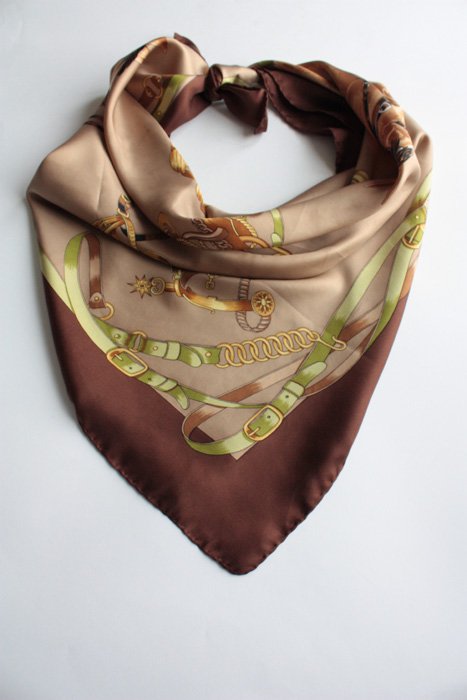 Piękna chusta we wzory charakterystyczne dla domu mody HERMES. Material to prawdopodobnie jedwab (ręczne rolowanie).