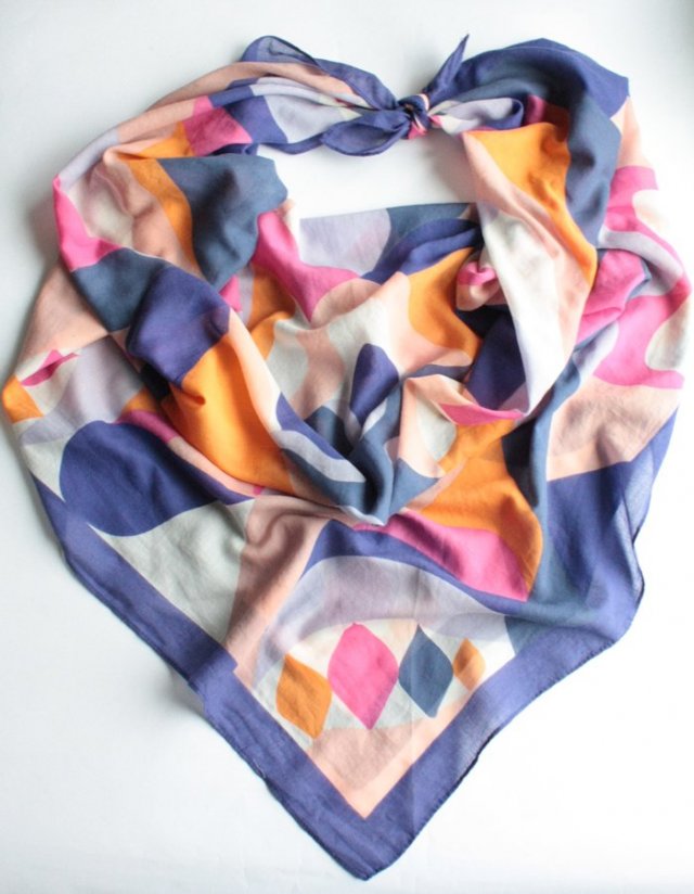 Duża, wielobarwna chusta z miękkiej tkaniny (prawdopodobnie bawełny lub wiskozy).