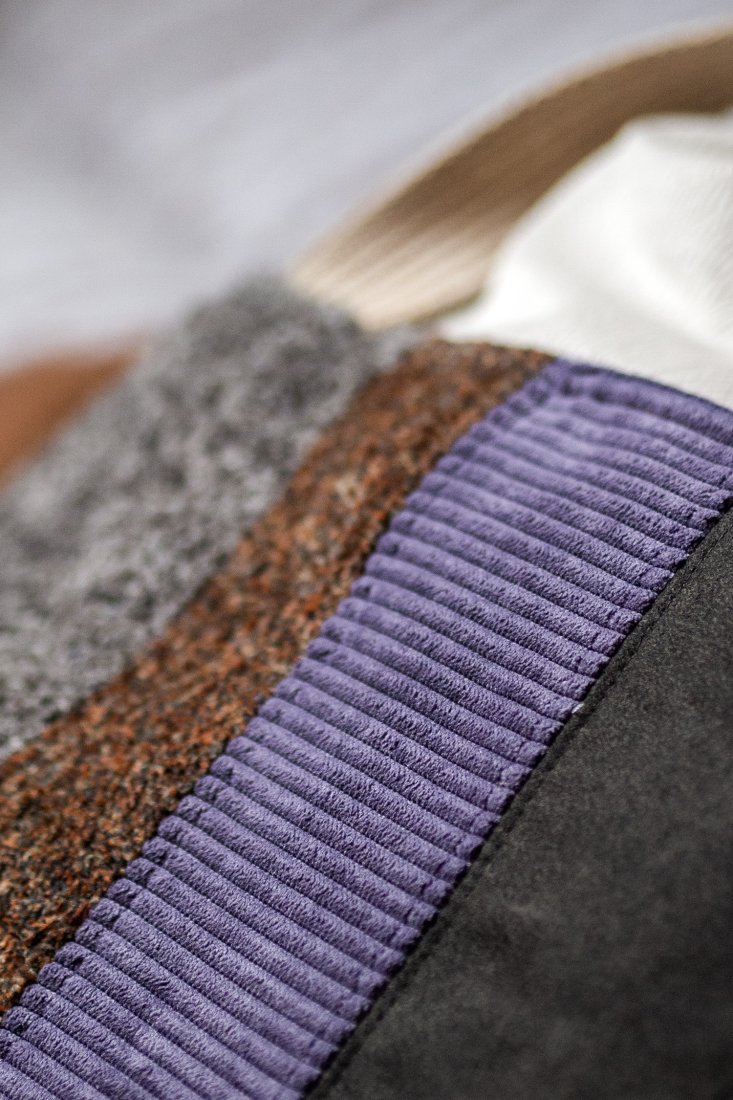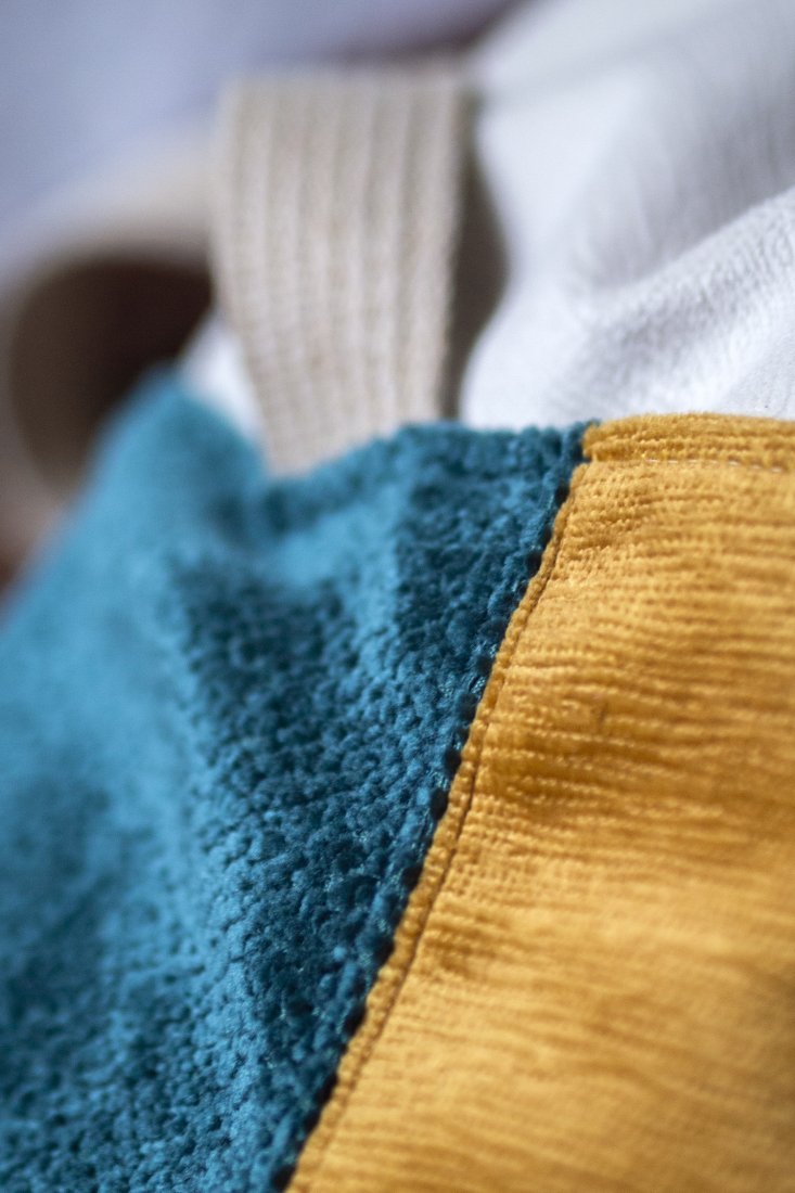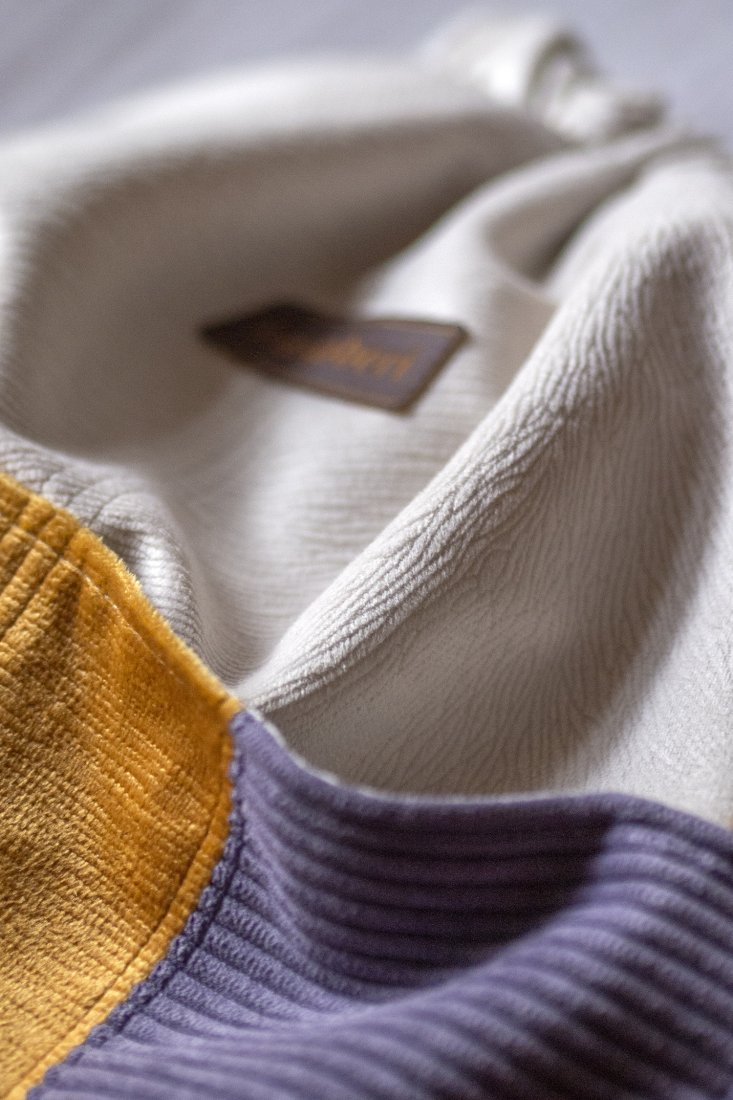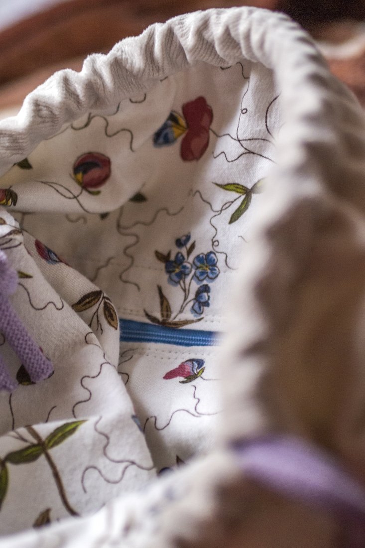 Wykonana z tkaniny w kolorze ecru, z przodu dwie kieszenie z kilku rodzajów kolorowych tkanin. Bawełniane, beżowe pasy i jasna, bawełniana podszewka w kwiaty.