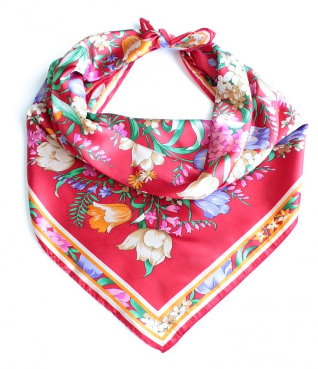 Duża, wielobarwna chusta w kwiatowe wzory.
