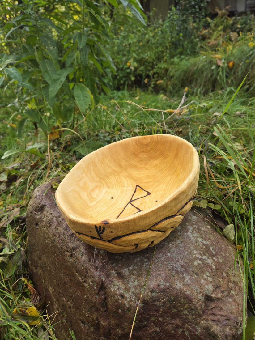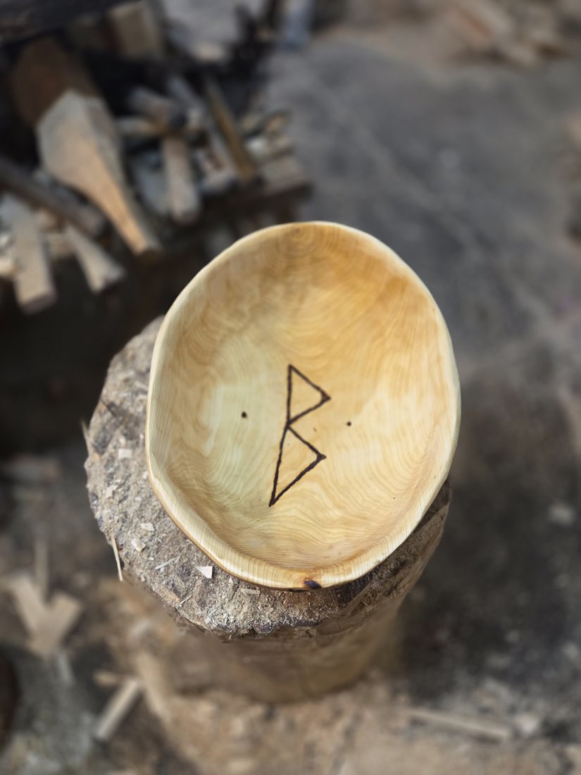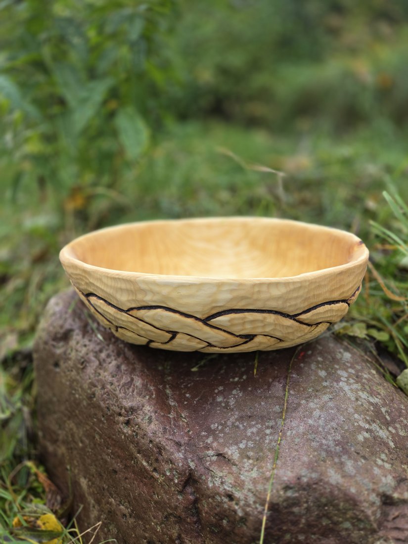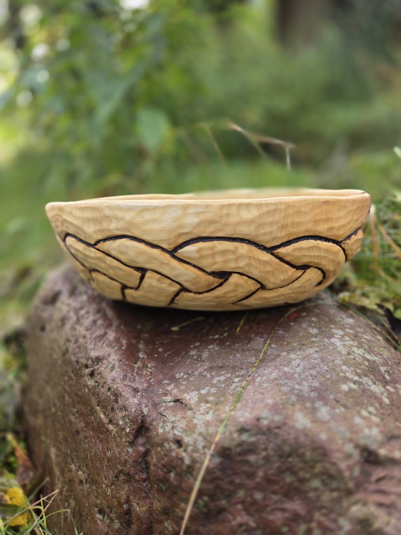 Drewniana dzieża do ciasta. Wykonana ręcznie, rzeźbiona, wzór podkreślony przy pomocy pirografu. Bardzo dobrze zakonserwowana olejem lnianym. Gotowa do użycia. Długość misy - 35 cm, szerokość- 26 cm, wysokość - 11 cm, pojemność 3.5 litra. Na dzieży wyrzeźbiłem plecionkę wczesnośredniowieczną inspirowaną sztuką skandynawską oraz trzy runy, litery związane z tematem chleba: Jera (żniwa), Fehu (dobrobyt, obfitość) i Berkano (płodność, rodzina, wspólnota).