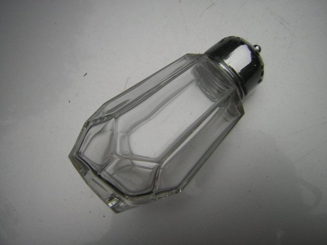 Niespotykana.Duża. Z założenia PUDERNICA na Cukier Puder, ale świetnie sprawdza się jako solniczka/ solnica raczej do grubej soli morskiej. Nowoczesna, gruboszklana, sześciokątna. Z metalową nakrętką, chromowaną. Nie sygnowana, nie spotykana ;)