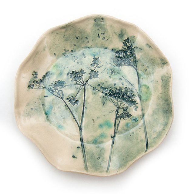 Jest to ręcznie wykonana duża patera ceramiczna, z motywem roślinnym.