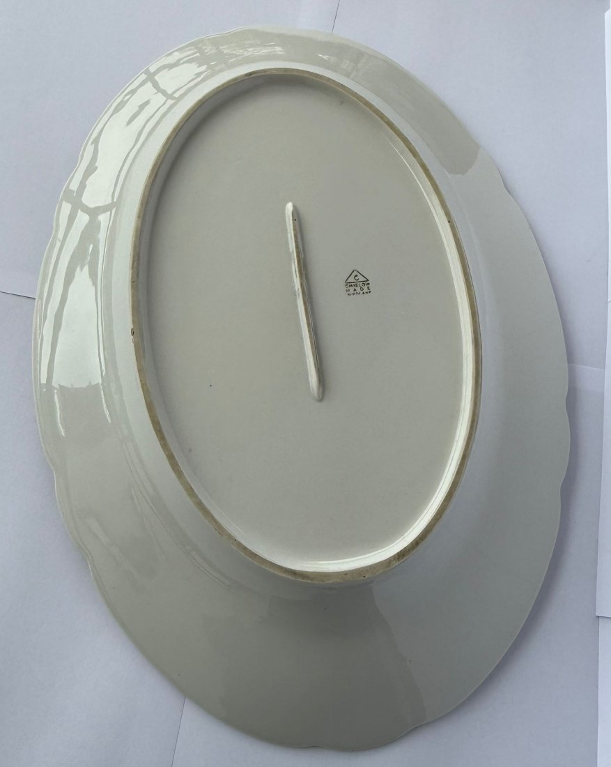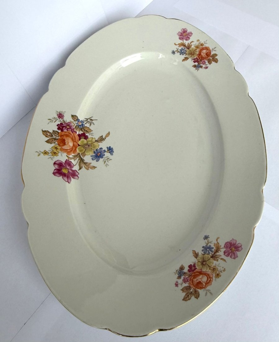 Duży, porcelanowy półmisek renomowanej wytwórni Ćmielów z okresu PRL (lata 50–70). Posiada klasyczną, owalną formę z delikatnie falowanym rantem oraz subtelny kwiatowy wzór w ponadczasowym stylu.