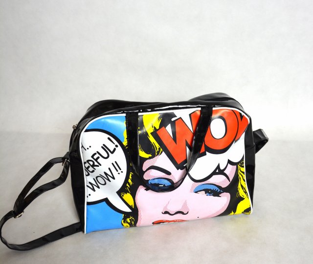Duża pakowna torba z printem w stylu pop art, torba bardzo pakowna, posiada sztywne szerokie dno, zasuwana na suwak, w środku jedna kieszonka na suwak + podszewka.Tył torby czarny lakierowany (pasek również lakierowany . Do noszenia w rękę, na ramieniu, oraz jako listonoszka (posiada długi regulowany pasek.