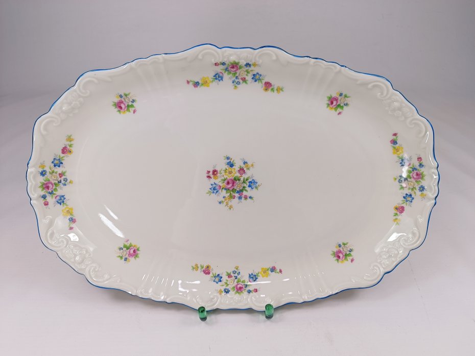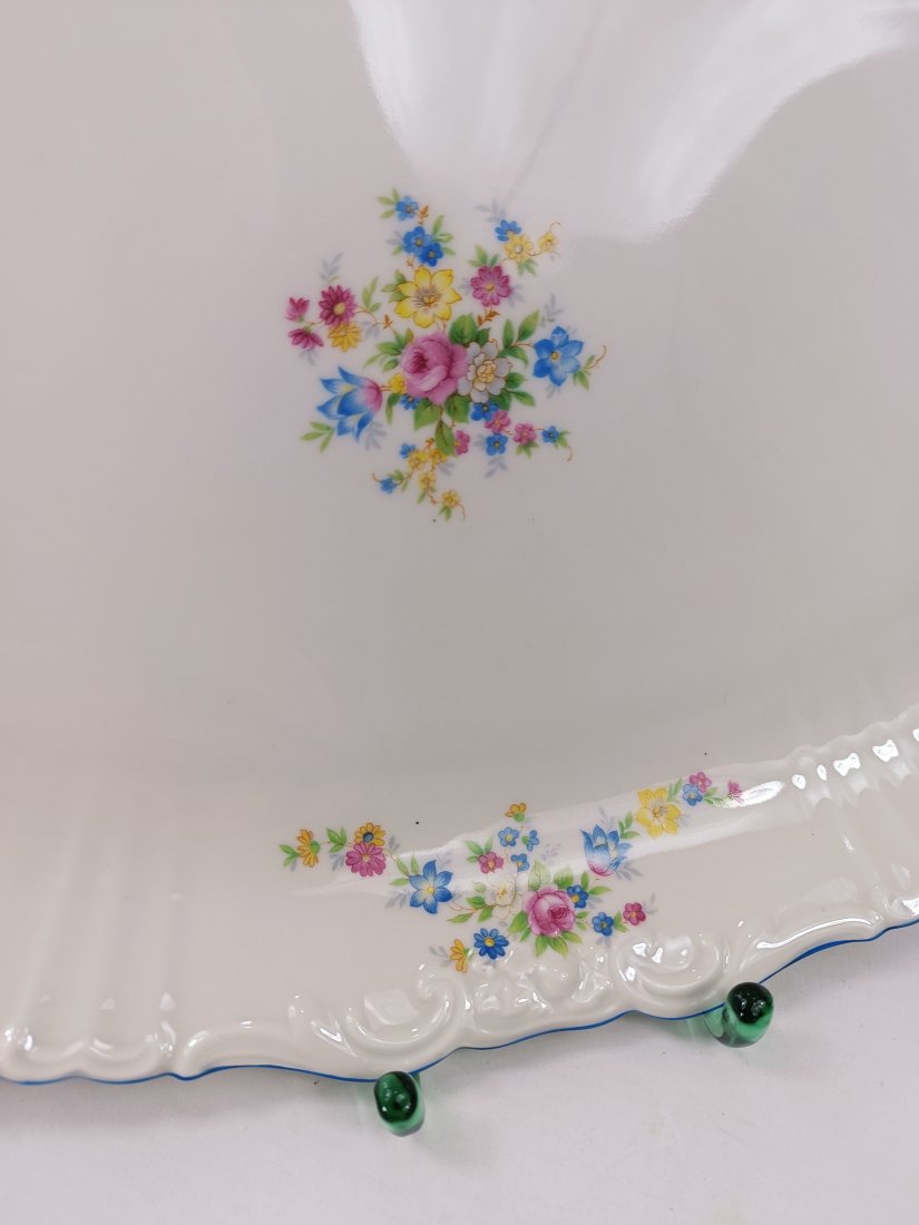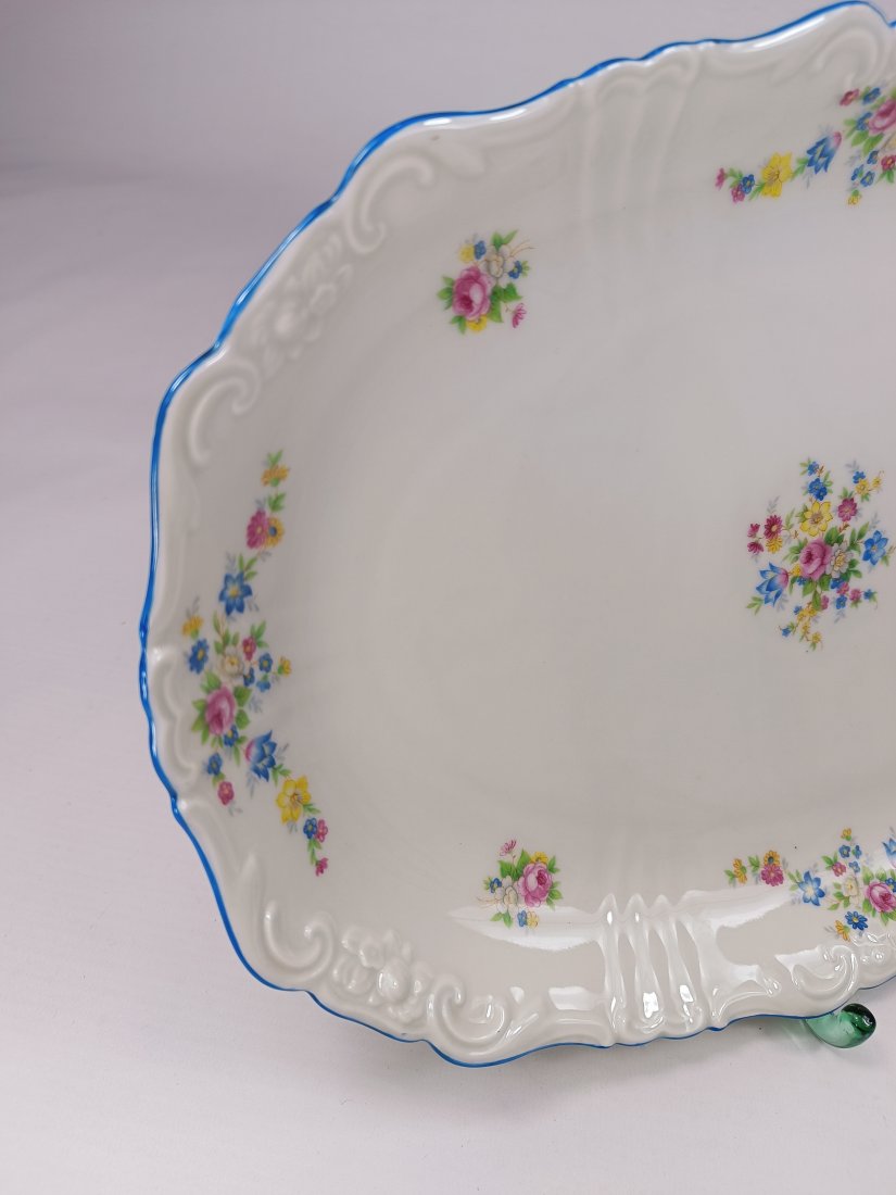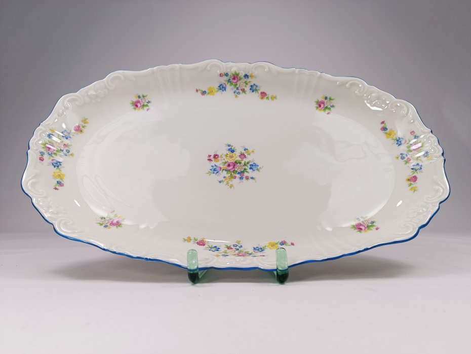 Duża porcelanowa patera Art Deco z lat 30. Stan zachowania bardzo dobry. Szerokość 39 cm. Na innych ogłoszeniach mam więcej naczyń z kompletu.